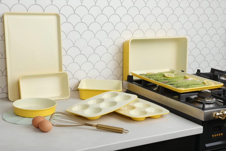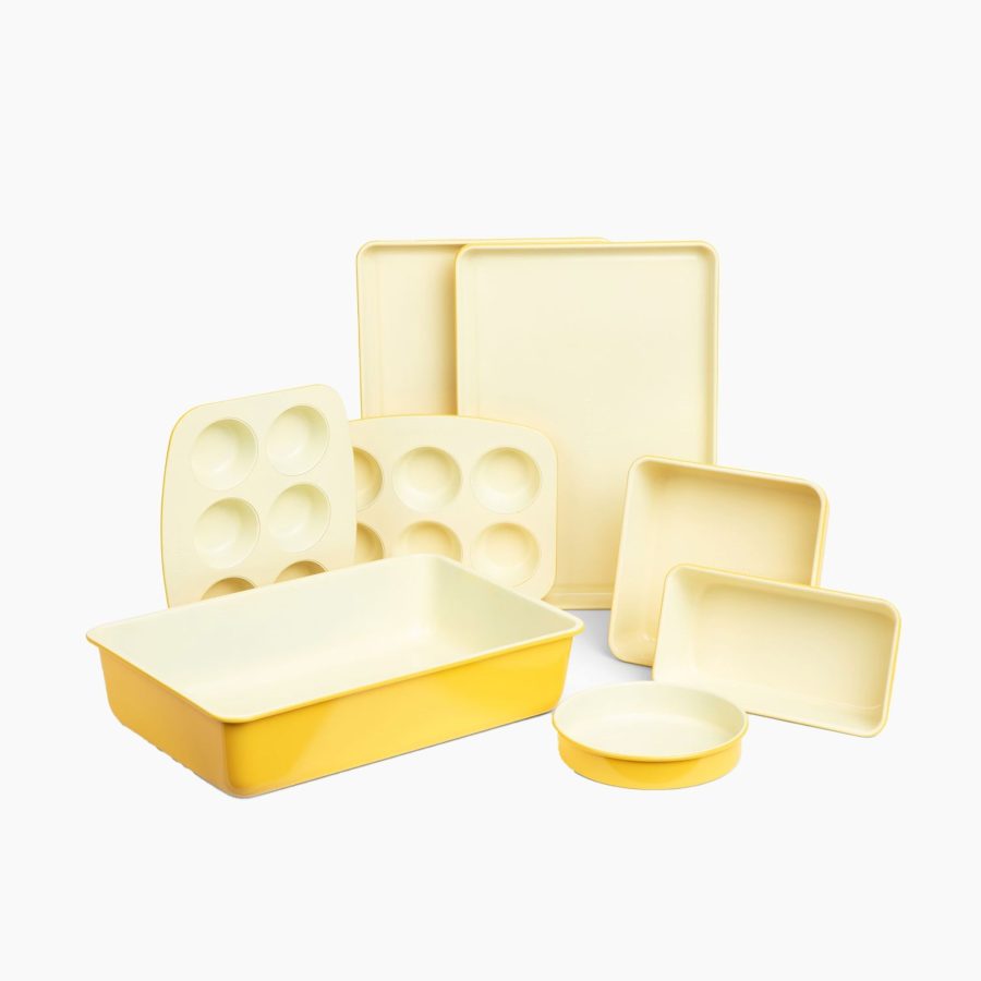 The complete eight-piece collection includes two baking sheets, two six-cup muffin tins, a loaf pan, a round cake pan, a square cake pan and a deep roasting pan. It’s literally everything you actually need to tackle roasted veggies, Sunday-morning muffins or a chocolate chip banana bread (a recipe that’s included in the set! Can’t wait to try it!).