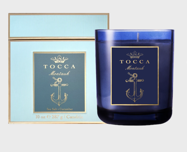 TOCCA’s Montauk smells as fresh as an ocean spray with a touch of sea salt, sea grass and cucumber. Green, aquatic, uplifting and gorgeously packaged, this 10-ounce candle is sure to please as a gift or as an elegant home refresher. Balmy air meets cleansing waters in the Montauk candle, evoking unspoiled havens and pleasure. The candle’s fragrance is richly infused with a luxurious, proprietary soy-wax blend candle and a 100% cotton wick, then hand-poured into a modern blue glass keepsake jar.