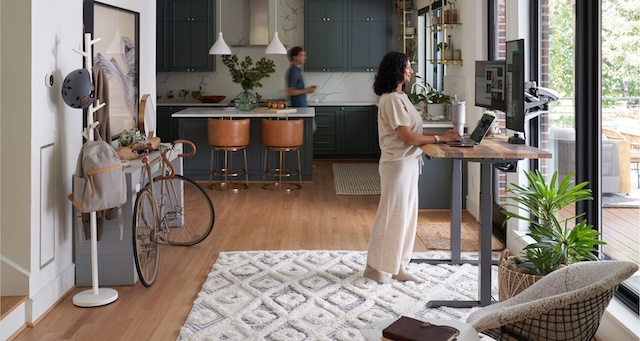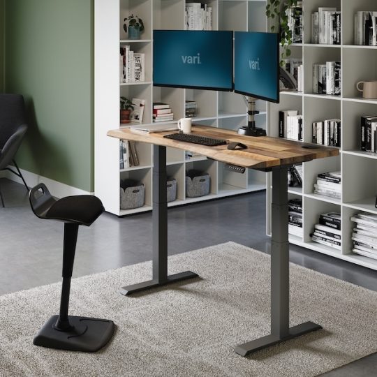 Vari has also solved a health problem for remote workers: every so often you can press a button on the right side of the desk and adjust it to your standing height, enabling you to avoid sitting all day, which tends to pack on the pounds.