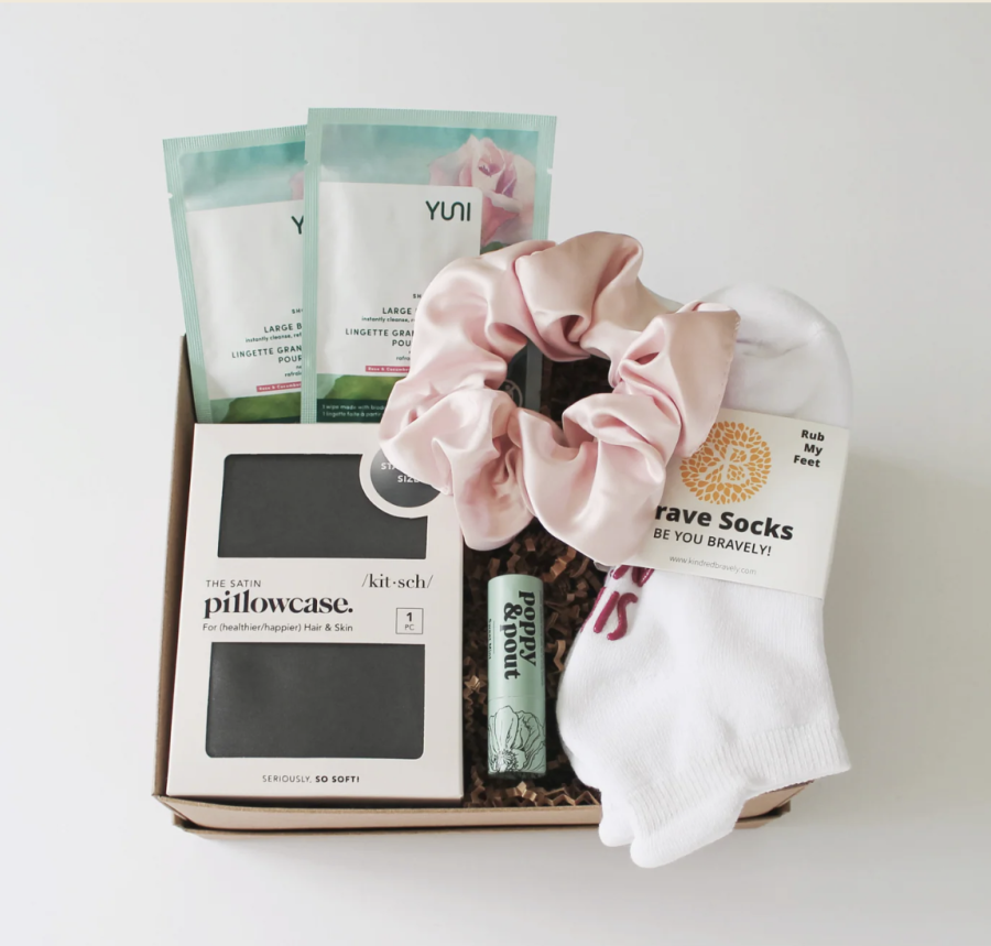 The Let’s Go, Baby! Box includes: YUNI | (2) Large Body Wipes, Poppy & Pout | Lip Balm, Mint, LoveLina | Silk Satin Scrunchie, Pink, Kitsch | Satin Pillowcase, Charcoal, Kindred Bravely | “If You Can Read This, Rub My Feet” Non-Skid Socks, Personalized Greeting Card + a Gift Box with Chiffon Ribbon. Expectant moms will appreciate the thoughtfulness of this gift box.