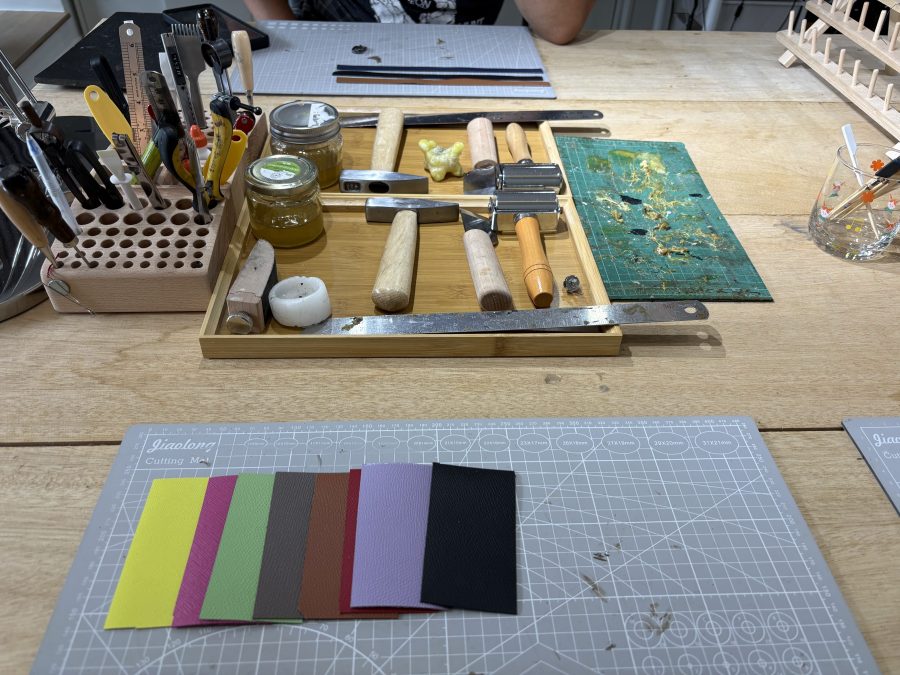 Next, Lor had us glue leather and the interior pieces together. Once it was glued we cut the leather to size and began sewing. Sewing is an activity that transports me to high school. I wasn’t the best nor the worst, and in this moment I was ready to take up the challenge.