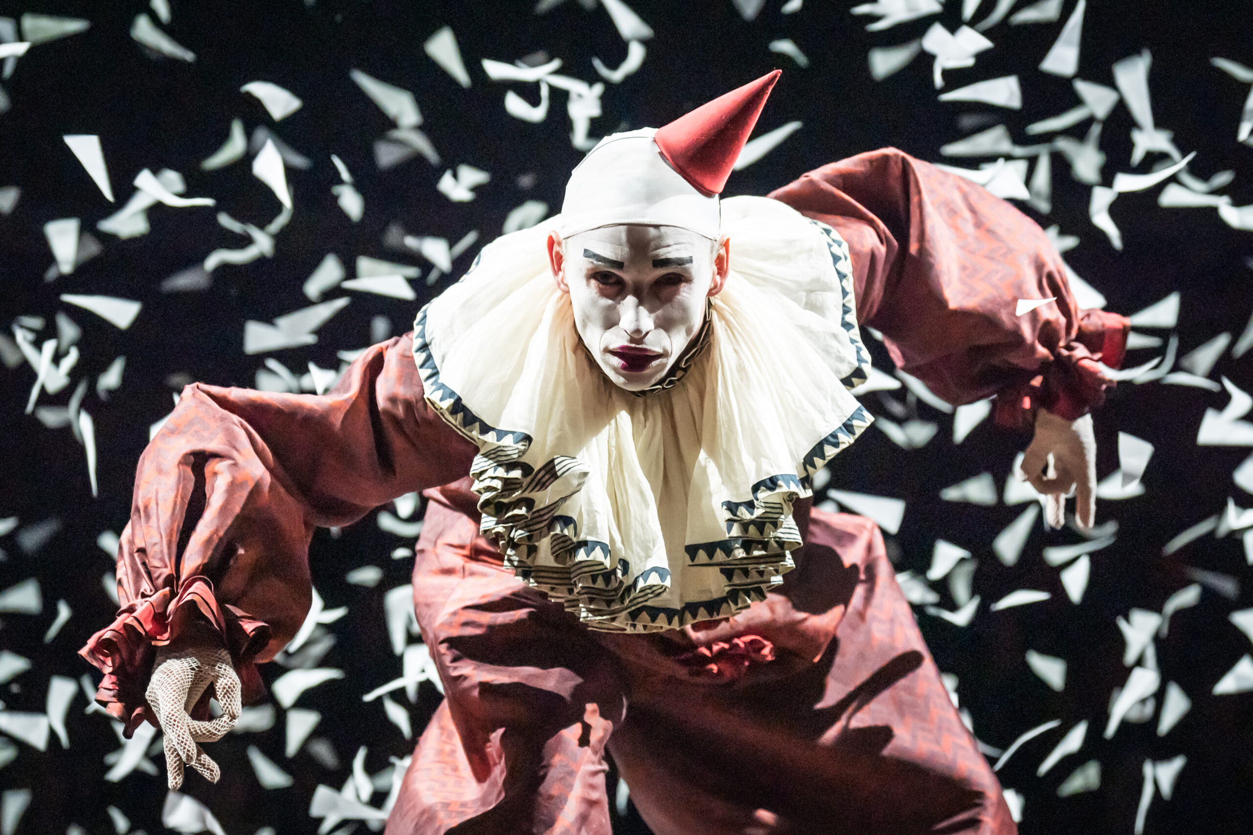 Redmayne starts as the mischievous master of ceremonies of the Kit Kat Club, but his character is a shapeshifter, bridging reality and fantasy. During “Money Money,” he dons an army helmet and black-and-white mime-like face paint. He dances with a gorilla in “If Only You Could See Her,” wearing a clown suit, bright red lips, and a party hat, a little off-kilter.