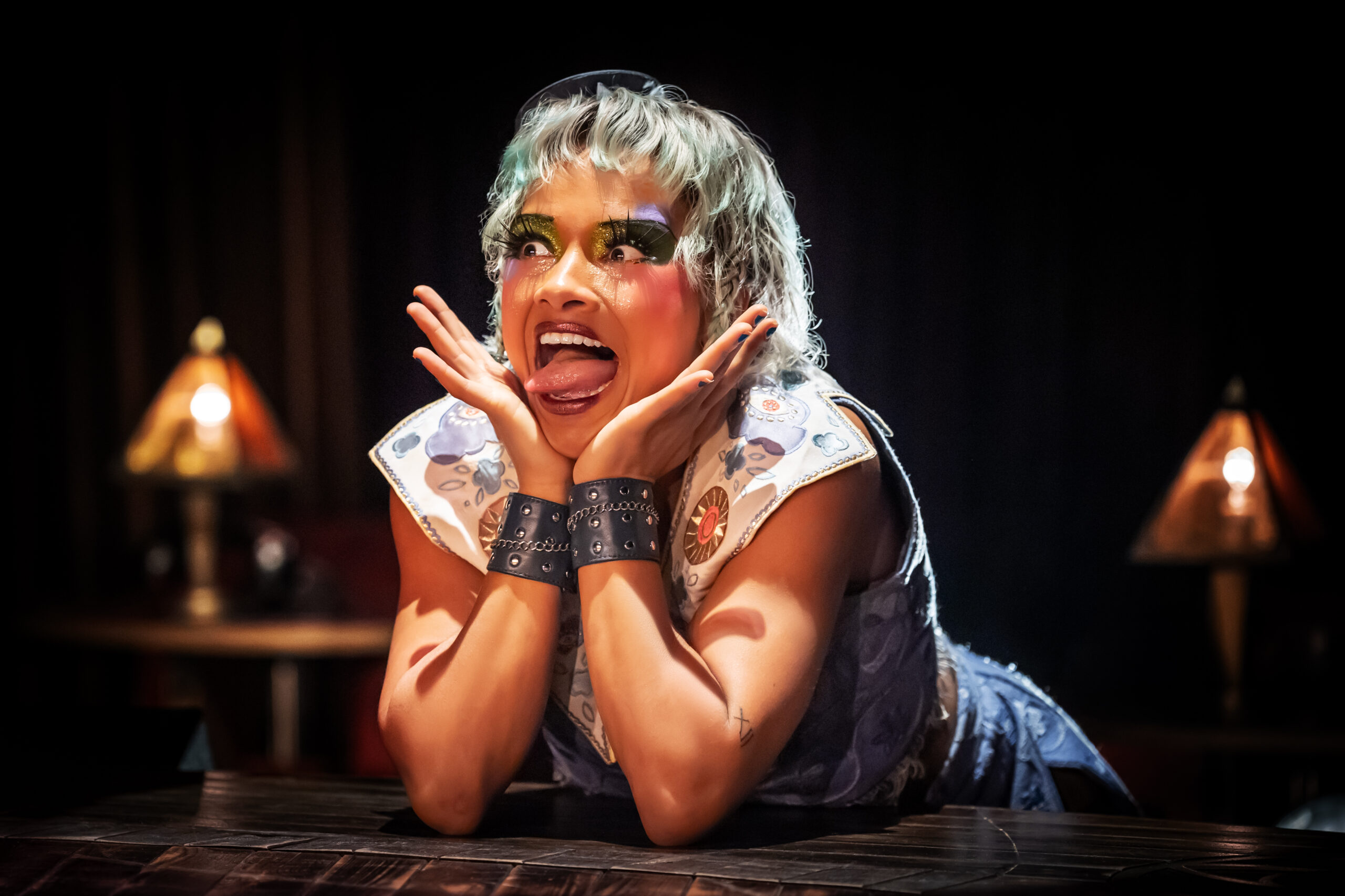 “When creating the designs for this show, I looked to a variety of source material from the time to give the looks a grounding in history: the shapes of the brows, the placement of the blush, and of course, the lip shape,” adds Common. “But I imagined the audience being contemporary with the cast and viewing the show through a feverish, intoxicated lens.”