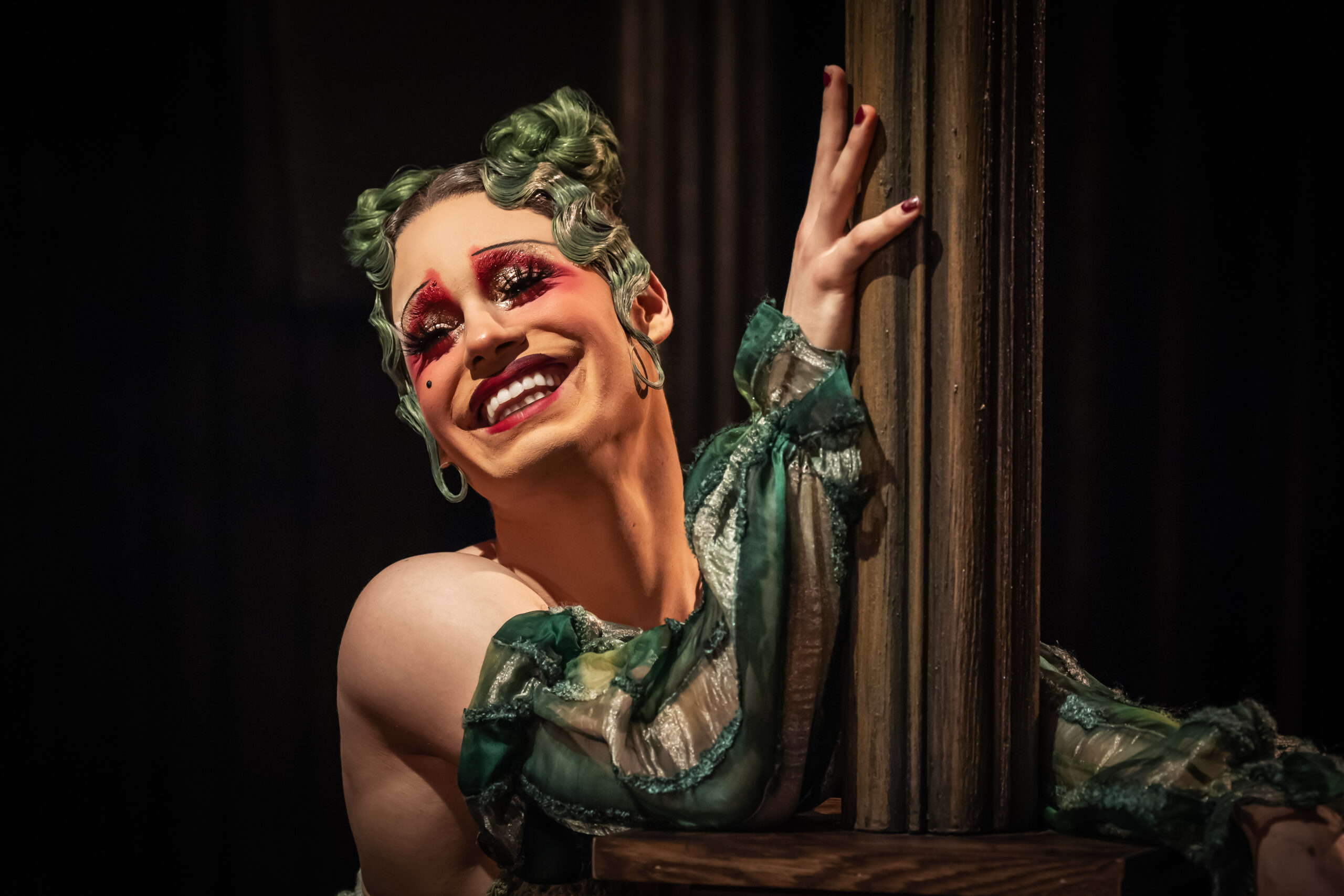 Details bring a story to life, but they’re all the more important in this current Broadway production of Cabaret. Directed by Rebecca Frecknall, this revival of the timeless musical is an immersive experience: audience members are handed a shot of cherry schnapps at the door and dinner-service seats surround the arena stage. A challenge with staging a show in the round is that there are no backdrops and minimal props, giving the cast fewer resources to set the scene. But this is where the creativity of Hair & Wig Designer Sam Cox and Makeup Designer Guy Common truly shines through.