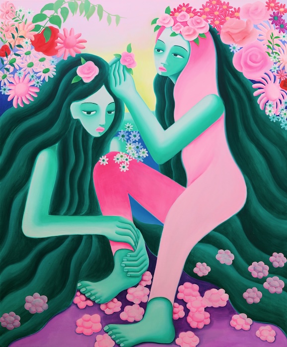 SVA MFA ’11 alumni painter Adehla Lee presents two new figurative paintings celebrating the divine feminine lineage of her family back home in South Korea. In colorful homage to her Grandmother’s shamanic healing practice, Lee’s renderings of young women amidst ornamented floral backdrops recall how, despite laws that forced magical healers underground in Korea throughout the artist’s childhood, her Grandmother’s legacy still lights the threshold where inherited cultural wisdom meets natural law. Queercore Chilean feminist no-genre artist and Ayurvedic practitioner (SVA MFA ’11), Elisa Garcia de la Huerta’s textiles and soundscapes are informed by on-body research at the intersection of tantra and techno.