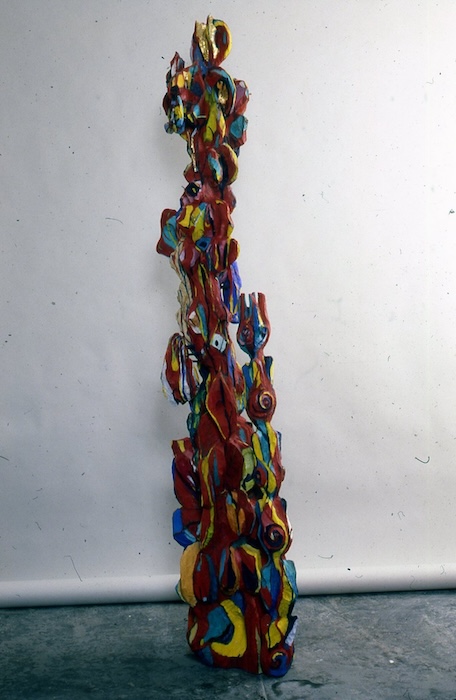 Gender-non-conforming Italian American artist Nancy Azara’s sculptures and installations of carved and painted wood are towering, elevated altars to uncompromising female divinity. After the artist passed in 2024, a younger generation of young femmes following in her footsteps continues to venerate her groundbreaking work as a founding member of NYFAI, a feminist artist institution known for its groundbreaking consciousness-raising practices in the 80s. Evening Star will include one of Nancy’s older and rarer sculpture works, a full-size totem-like stick, made from oil, tempera, and gold leaf on carved and bleached wood, titled Sun Goddess (1983).