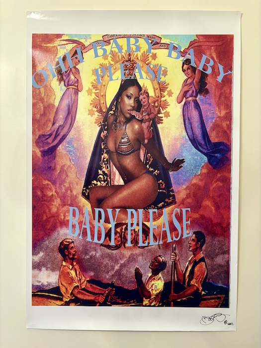 Also included in the exhibition is Displaced Oshun Theory #5, a collage made by artist Marcia Jones. Drawing on a larger body of work from the early 2000s, Jones’ series invokes the Yoruba Goddess of Love and Intimacy, Oshun, as a “displaced” figure within popular culture. Brought to life in a series of works on paper, Jones correlates the way rappers worship the female body in strip clubs to the way men of the Vodun religion pray at the foot of an altar. Despite the distorted lens through which we often view popular music rooted in African diasporic culture here in the West, within a more Afrocentric cosmology, sexuality, trance, and the healing use of vital sexual energy cohere in dance as sacred medicine. “The way they would put money down – call me twisted – but, they made it rain on these mothafuckin altars,” reflected the artist in a 2013 artist talk posted on MEKtext Network.
