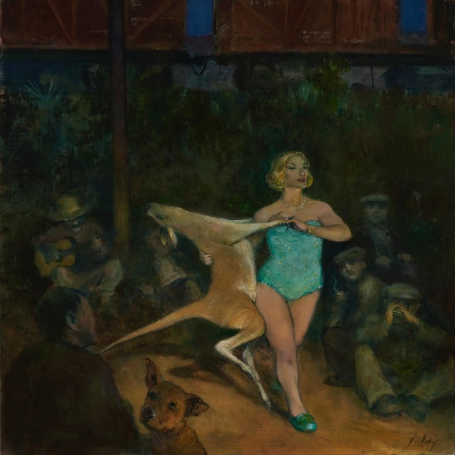 I have a series called “American Ghosts.” It is sort of a satirical novel in paint, part Mark Twain, part Wizard of Oz in feel. It follows the adventures of three ghosts: Betsy, part of the Gold Rush; Belle, the Confederate militiawoman; and Nancy, a circus strongwoman from the Dustbowl. Their adventures together take them across both America and American history. Many of those paintings make me smile but I think my favorite is Nancy dancing with the boxing kangaroo she has rescued from the circus.