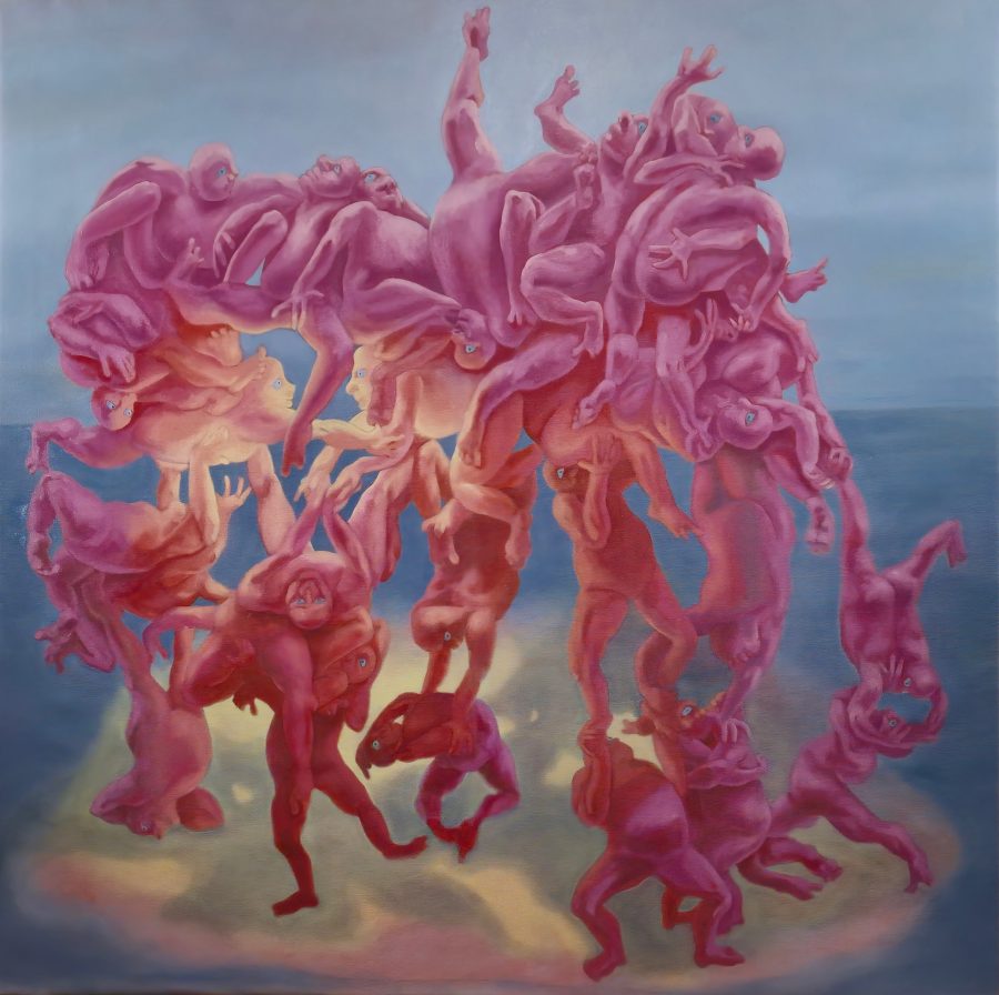 My art is contemporary figurative. For several years I have been painting an imaginary world inhabited by humanoid creatures that exist outside of politics and beyond binaries and some of the laws of physics. The creatures in it are affectionate, playful and emotionally expressive, but entirely platonic. I deliberately remove gender markers and anatomical cues, to challenge how we instinctively assign identity and meaning to bodies, and to address western culture’s discomfort with physical touch. My compositions are sparse, offering contextual clues to suggest a setting but not a complete story. This invites viewers to project their own interpretations and narratives onto the scene, co-creating meaning in a world free from familiar constraints. In the last 12 months, I have begun adding animals and flora to this world, in a new series called “The Garden” that contextualizes my menagerie and humans in separate realms existing in different forms of time (circular and linear). It explores how animals – who were allowed to remain in the Garden of Eden living in circular time – regard humans that are stuck outside the garden walls in our linear time existence.