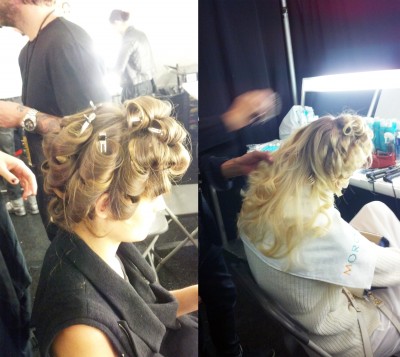 Runway Stylist Peter Gray for Moroccanoil was inspired by chic ocean side glamour, Badgley Mischka soft pastels and 20’s and 30’s inspired modern day hairdos. Peter wanted his vision to come off elegant, soft, smooth, sophisticated and glossy. He first started by combining Moroccanoil Treatment Light and Moroccanoil Root Boost by sectioning the hair and combing it through. After Peter rough dried the hair he then sprayed the hair with Moroccanoil Luminous Hairspray Strong. He set the hair using 1-1/2” curling iron before pinning the curls in reverse directions. By pinning the curls in opposite directions will create soft natural texture to the hair. After a few moments Peter then combed through each curl to produce a smooth surface. When combing out the curls he then rolled the hair into a small unfastened horizontal roll at the nape of the neck. To secure the roll he used u-pins to protect the length of the roll. Once finished Peter sprayed Morrocanoil Glimmer Shine spray on the palm of his hands and lightly applied to the surface of the hair, leaving the hair with a glossy finish.