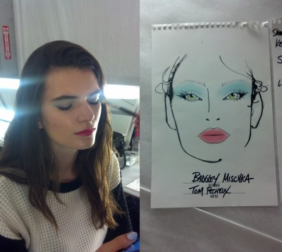 The renowned Tom Pacheux was the lead makeup artist for Badgley Mischka spring 2014 fashion show. Tom envisioned transparent skin and imagined fresh water striking the face. He wanted the face to appear as a mermaid; light, fresh and elegant. Prepping the model’s skin with moisturizer, then lightly dabbing concealer with his fingertips on areas that needed coverage for a fresh and refined look. On the model’s eyes he applied M.A.C. Chromacake in Pure White and Cyan Blue, with a burst of M.A.C. Fix+. Combining these colors together you develop a soft aqua color, resembling the ocean. After creating the perfect shade of aqua he then applied from the lash line to the brow, covering the entire eyelid. To make the eyes even brighter, Tom softly lined the water line using M.A.C. Eye Kohl in Fascinating, an intense matte white. Not only will the eye appear bigger and brighter, the eye shadow will also appear bluer. To finish the eyes he applied layer after layer using M.A.C. Haute & Naughty Mascara. He wanted the lashes to be thick, long and full of volume. To enrich the lashes even more, Tom painted a thin black line along the top lash line using M.A.C. Blacktrack Fluidline. Last and final step, Tom mixed M.A.C Pick Me up Pink and April Flowers from M.A.C Spring 2014 lip palette. Tom suggests applying lip color with fingertips, giving the lips a satin coral finish.