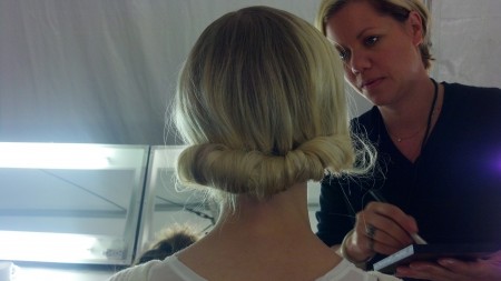 Runway Stylist Peter Gray for Moroccanoil was inspired by chic ocean side glamour, Badgley Mischka soft pastels and 20’s and 30’s inspired modern day hairdos. Peter wanted his vision to come off elegant, soft, smooth, sophisticated and glossy. He first started by combining Moroccanoil Treatment Light and Moroccanoil Root Boost by sectioning the hair and combing it through. After Peter rough dried the hair he then sprayed the hair with Moroccanoil Luminous Hairspray Strong. He set the hair using 1-1/2” curling iron before pinning the curls in reverse directions. By pinning the curls in opposite directions will create soft natural texture to the hair. After a few moments Peter then combed through each curl to produce a smooth surface. When combing out the curls he then rolled the hair into a small unfastened horizontal roll at the nape of the neck. To secure the roll he used u-pins to protect the length of the roll. Once finished Peter sprayed Morrocanoil Glimmer Shine spray on the palm of his hands and lightly applied to the surface of the hair, leaving the hair with a glossy finish.