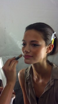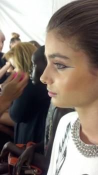 Throughout the Kaufman Franco Spring 2014 collection you will find bold colors, tribal outlines and beaded African inspired pieces. Frank B., lead makeup artist for M.A.C. Cosmetics was inspired by the cool, tough tribal pieces seen throughout the collection. Frank wanted to bring out the tribal vibe by creating a bold eye look (as seen on supermodel Alessandra Ambrosio). Using M.A.C. Black Track gel eyeliner he lined the upper and lower lash line with a thin black line, coming out from the outer corner of the eyes in a straight line. To heighten the eyeliner, the makeup artist chose not to use mascara or to fill in the eyebrows. By not using any products on the model’s lashes or brows, the eyeliner was the central focus for a tribal effect. Leaving the skin bare he opted to only use M.A.C. Mineralized Bronzer in Sun Power on cheeks, forehead and chin. To finish off the look a sheer lipgloss was applied on the lips.