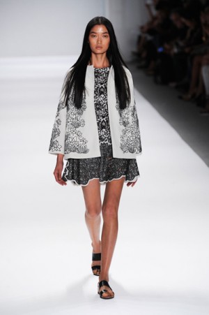 Makeup was equally laid back with bronzed and sculpted cheeks and eyelids, but no mascara or lipstick. While makeup traditionalists will tell you to either do a bold eye or a dramatic lip, the M.A.C artists, led by Maud Laceppe, seemed to eschew convention by doing neither. The result was an easygoing glow that didn’t clash with the prominent prints in Tam’s collection. Plus, skipping out on faux lashes and gobs of mascara? What could be more easygoing than that?