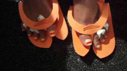 The effortless Cali girl look was made complete with Julep nail polish. Julep nails wanted to play off of Trina’s bold prints and bright colors. On the model’s fingers they went with a bold white polish called Bethany to enhance the vibrant colors seen throughout Trina Turk’s collection. For an extra dose of glamour nail art was added to the toes, applying a peach polish as the base called Hayden and a red stripe in Eileen for a the perfect bold accent.