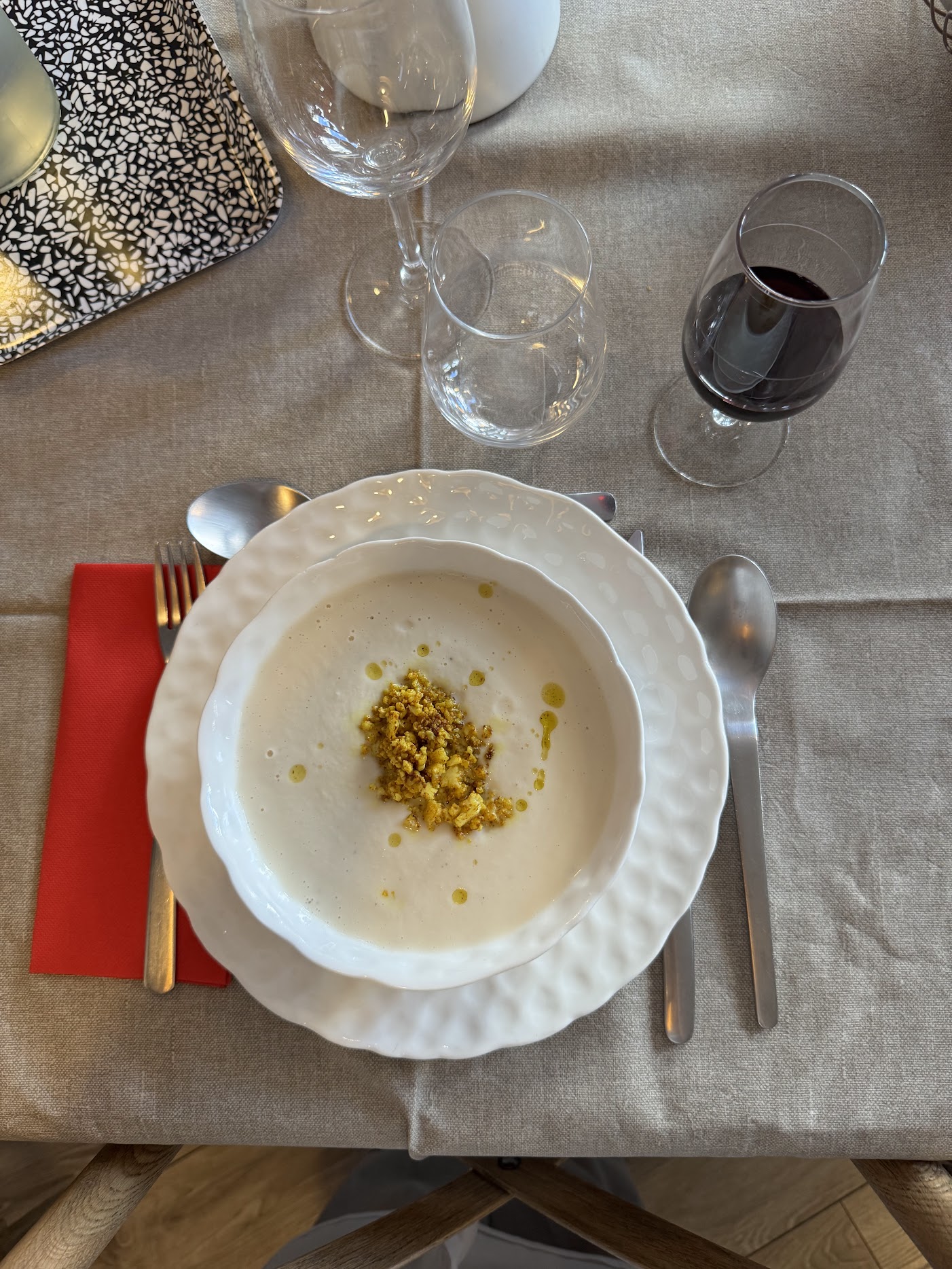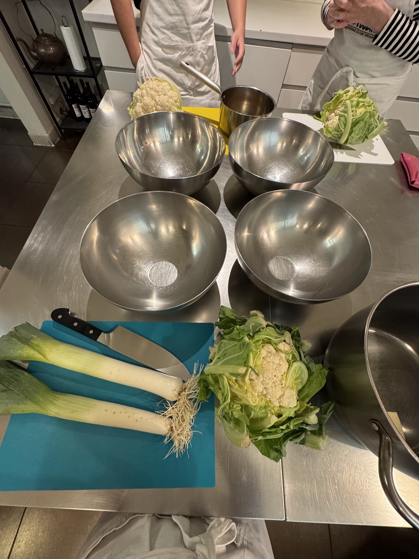 After a quick cheese lesson and sampling, we donned our aprons at Le Foodist and selected a station. My job was chopping and sweating leeks to use in the dubarry, which is a cauliflower soup. The name itself has nothing to do with the vegetable—like many French foods, as Frederic explained, it’s named after the royal or important person who requested it. In this case, dubarry takes its name from Madame du Barry, a mistress of King Louis XV who had a fondness for cauliflower.