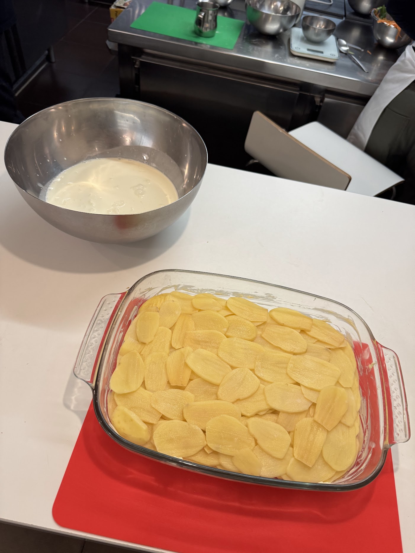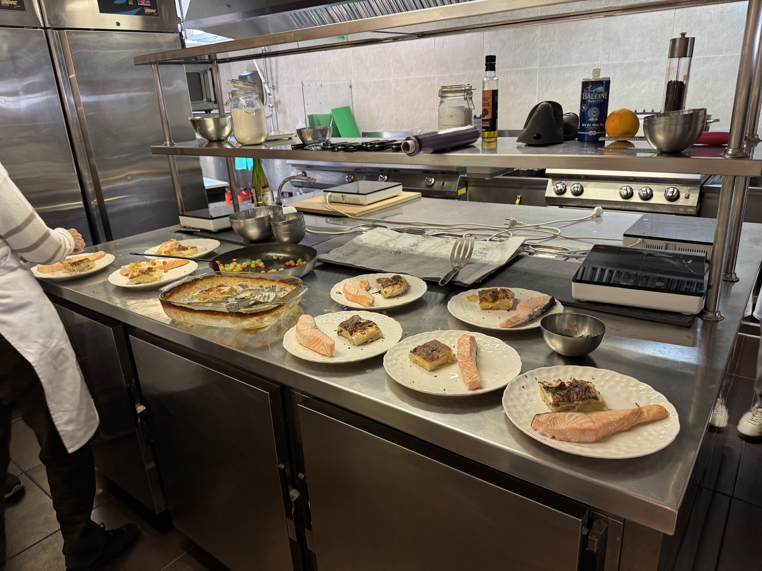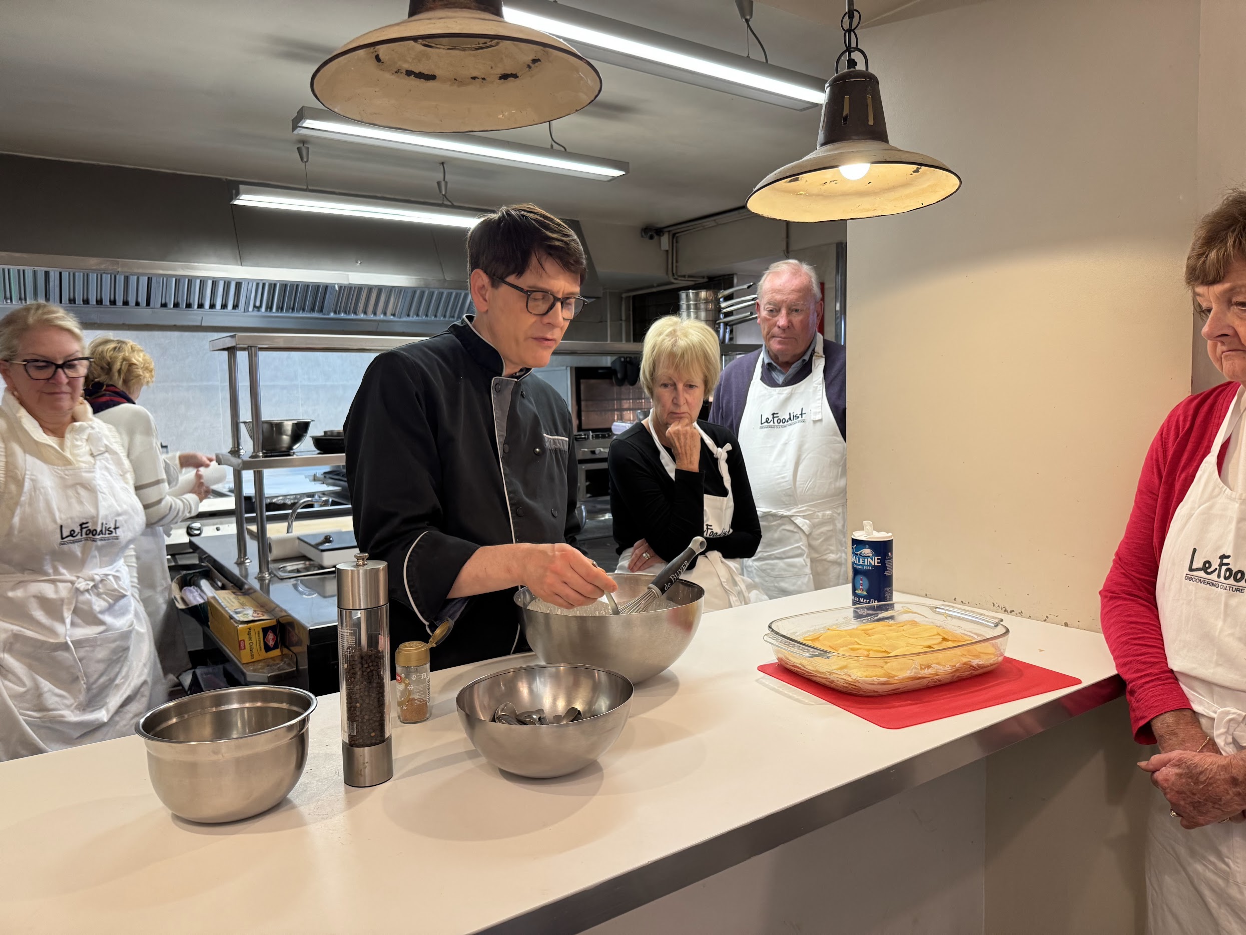 While it may seem that the objective of the class is to learn how to make x, y, and z, I walked away with a lot of tidbits to add to my overall cooking knowledge. For example, Frederic demonstrated the concept of enhancers: an item that elevates the taste of what you’re cooking, without the need to taste the enhancer itself. We rubbed raw garlic on the bottom of the gratin pan to enhance the flavor, like how we would add coffee to chocolate, or, surprisingly, black pepper to strawberries.