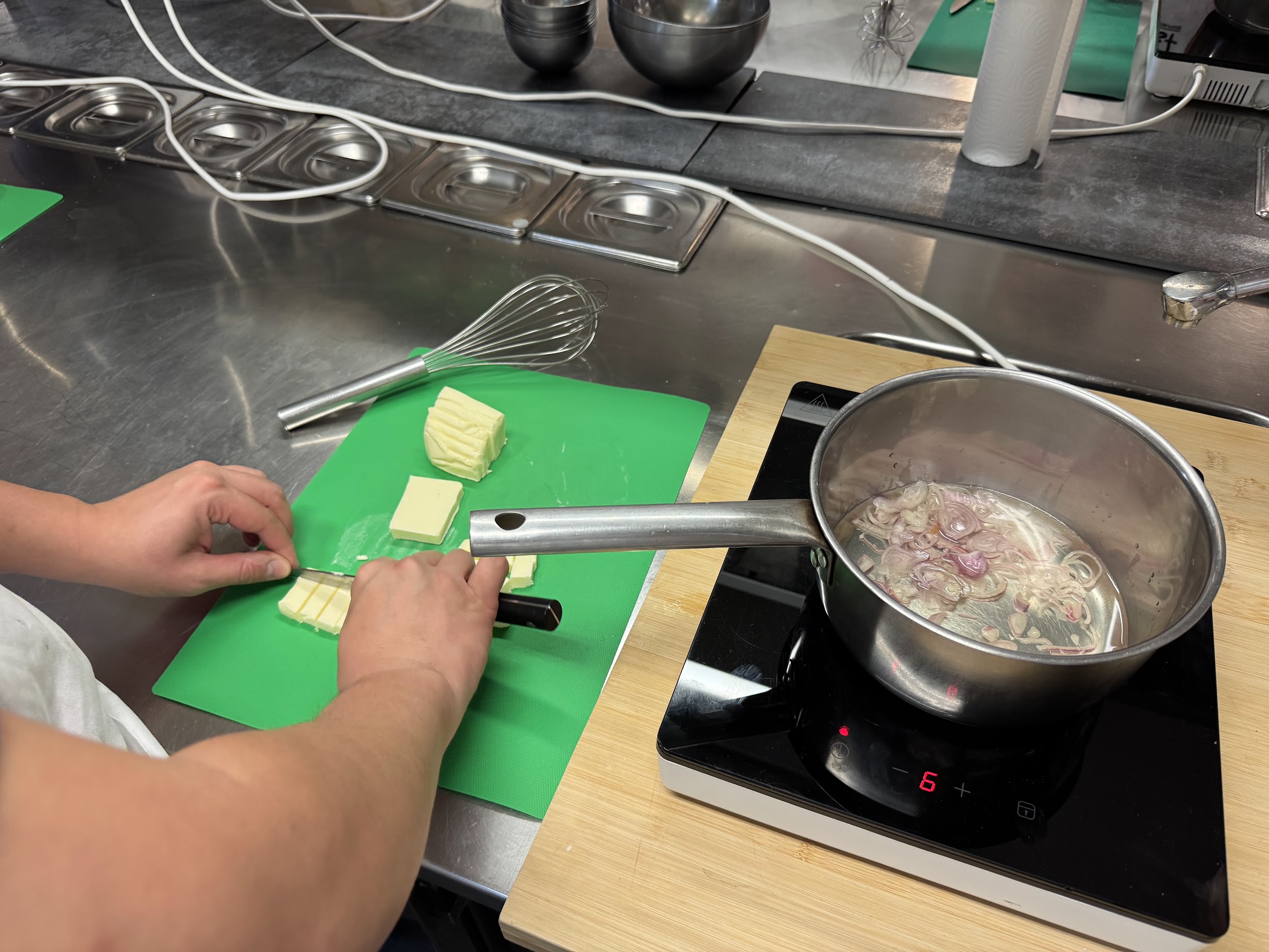 We hurried into Le Foodist’s cozy space on a cloudy morning, a few minutes late to our 9 a.m. call time. Our group of 10 enjoyed coffee and pain au chocolat as Frederic led us through the day’s lunch menu: dubarry, gratin dauphinois, baked salmon beurre blanc, and tarte tatin. As a novice cook, this all sounded a bit daunting, but exciting. It’s not often that you get to stretch your cooking muscles under the care of a French chef.