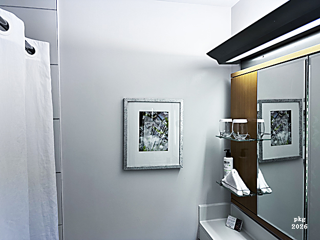 If a palatial bathroom is your priority, keep in mind the footprint here is tight. For more room, you’ll want to request a “Captain’s Quarters” in advance. Most standard rooms trade the bathtub for a petite, tiled walk-in shower. While the aesthetics lean toward a modest 2000s renovation, they are well-maintained and accented with sharp black-and-white photography of the Philadelphia cityscape.